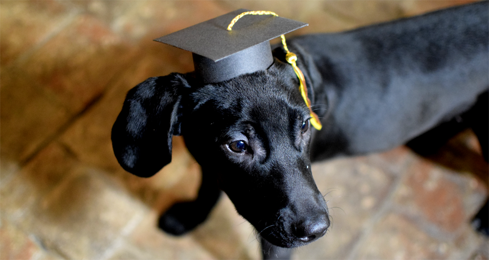 Posledních deset týdnů jsem s Kambodžou chodil do školy. Měla různý předměty jako třeba sedni, ke mně, přines, nesmiš si brat pamlsek ze země, ignoruj ten pamlsek a poslouchej mě, a tak dále. Deset týdnů je za námi, Kambodža vystudovala a zúčastnila se slavnostní promoce.