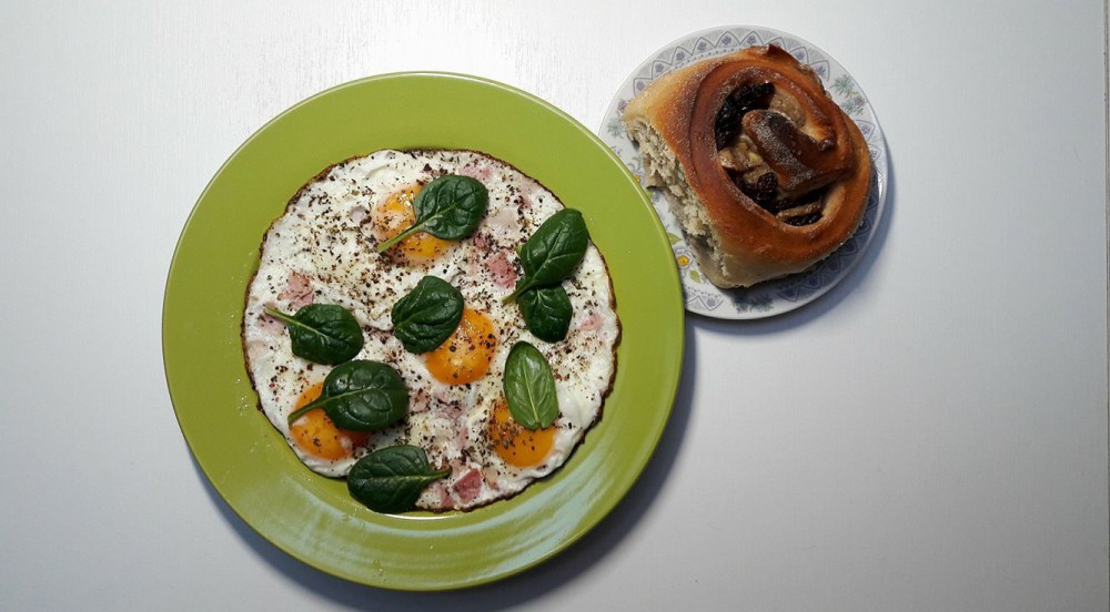 Petr často zdůrazňuje svou lásku k vajíčkům. Zdůvodňuje to tím, že vajíčka jsou zdravé tuky. V pondělí mi říkal, že jim mamka přivezla osmdesát vajíček a podle toho, jak moc mi Petr vajíčka doporučuje, si myslím, že osmdesát vajíček je pro něho zásoba tak na tři dny. Takže u Petra doma frčí vajíčka na snídani na všechny způsoby a já už to pomalu rozjíždím taky. Každopádně pro snídani platí, že se nemusíte bát tam poslat strašně moc jídla. Klidně i s tím žitným chlebem. Takže se na snídani teď po Petrových radách příjemně nadlábnu, někdy dokonce přežeru.
