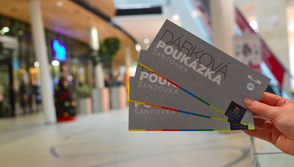 V Šantovce můžete pořídit dárkové poukazy v hodnotě 200,- Kč, 500,- Kč, 1 000,- Kč a 2 000,- Kč, a zakoupit je můžete jednoduše v informačním stánku v přízemí Galerie Šantovka každý den od deváté ranní do půl sedmé večerní. Poukazy dostanete navíc ve stylové dárkové obálce, takže si nemusíte lámat hlavu s balením dárku.