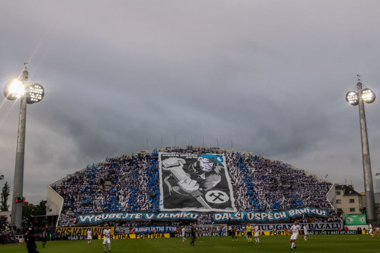 FOTOGALERIE/VIDEO: Pochod městem i povedená chorea. Fanoušci Slavie a Baníku obsadili Olomouc