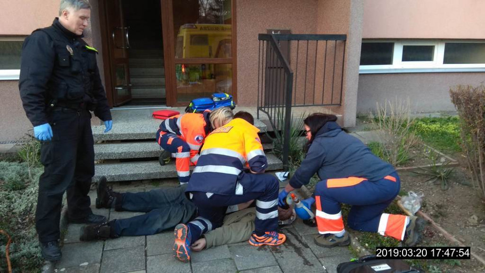 Strážníky zastavil svědek, který uvedl, že na schodech jednoho z domů spadl starší pán, který je zraněný. Muž si pádem způsobil krvácení na hlavě a po chvíli přestal mít hmatatelný pulz. Jeden ze strážníků zahájil nepřímou masáž srdce a druhý přinesl z auta přístroj AED, který ke zraněnému připojili.