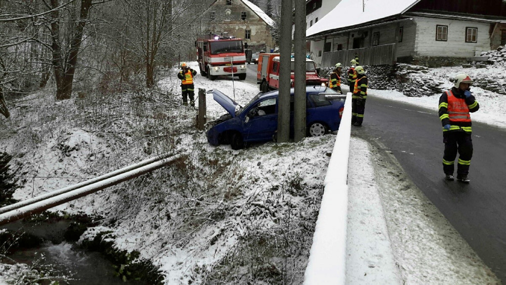 V pátek před třináctou hodinou vyjížděli jeseničtí hasiči k nehodě v Branné. Auto zůstalo po nárazu do mostku viset nad potokem.