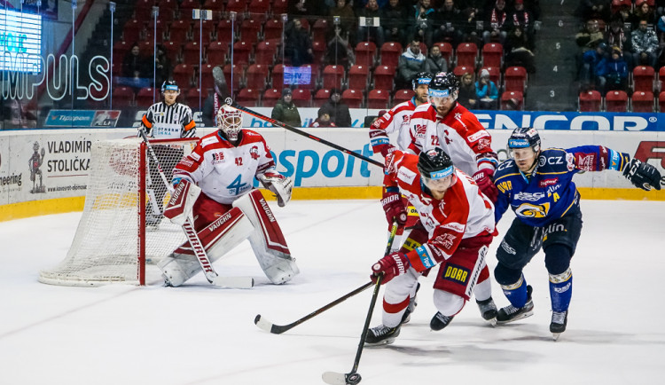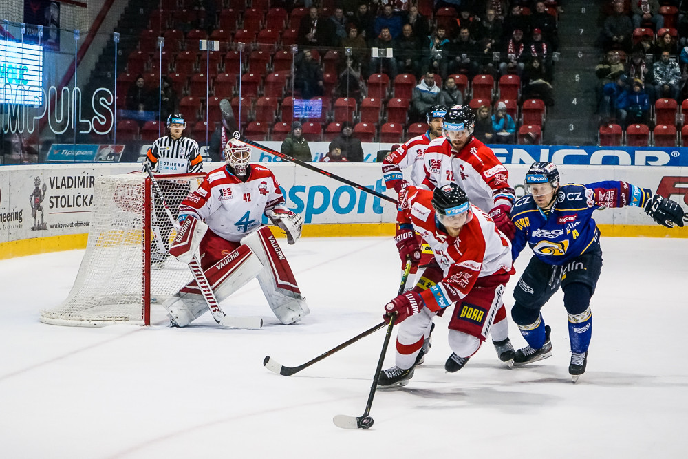 Dramatická situace se odehrála v olomouckém brankovišti přesně v polovině první třetiny. Konrádovi propadla Kubišova dělovka a Hanáky na brankové čáře pohotovým zákrokem zachránil obránce Švrček.