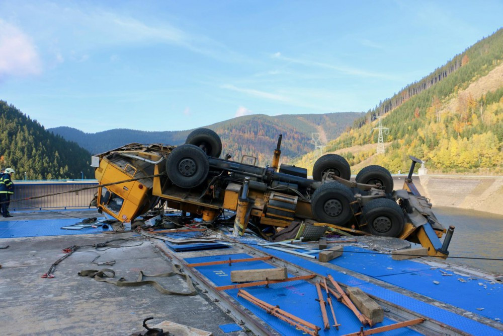 Autojeřáb se na betonovém objektu dolní nádrže elektrárny Dlouhé stráně převrátil loni 13. října při pravidelné revizi česel. Těžký stroj visel přes hranu takzvaného sdruženého objektu elektrárny směrem k vodní hladině dolní nádrže. Hasiči převrácený jeřáb nakonec sesunuli na dno dolní nádrže. Jeřáb je nyní 25 až 50 metrů pod hladinou podle toho, jaká je fáze přečerpávání vody mezi dolní a horní nádrží.