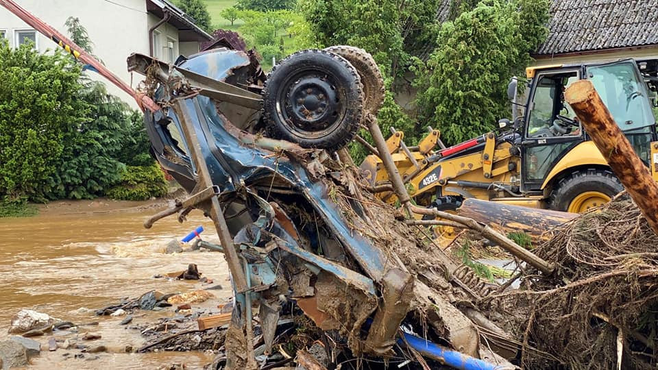 Blesková povodeň mu doslova uvěznila dům, z koryta ucpaného naplaveninami se i dopoledne voda valila po cestě a nesla s sebou vše včetně klád, které mu narážely do domu. "Voda dnes ráno už ustoupila, ale několik baráků je pod vodou jen kvůli zatarasenému potoku. Nejhůř jsem na tom já a další tři domy, čekáme na bagr. Auta jsme nezachránili, všechny tři jsou pryč. Mám je na dvoře, nasáčkované do sebe," posteskl si muž.