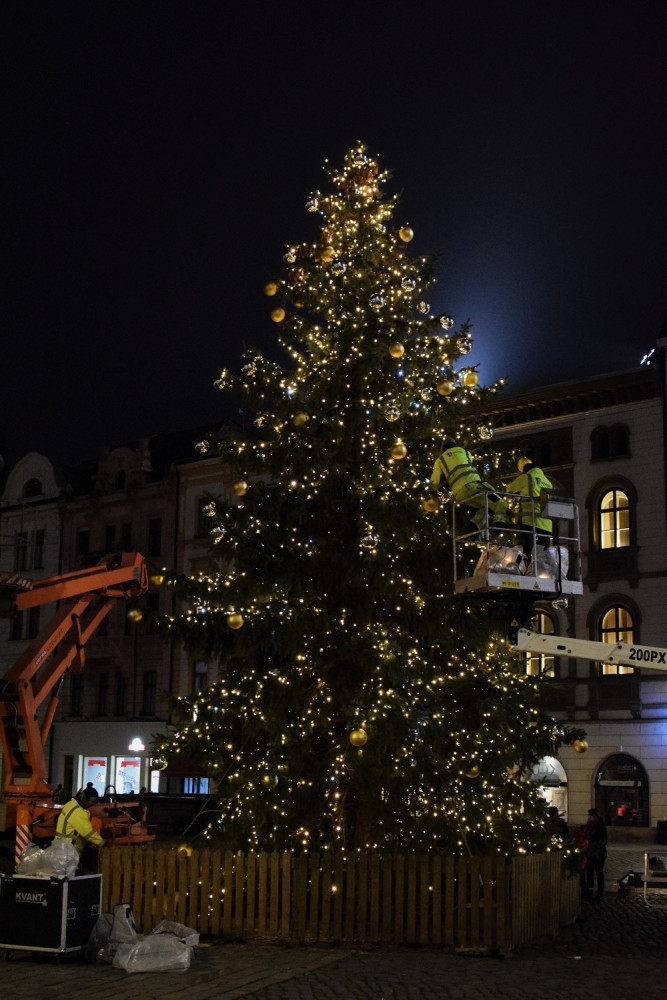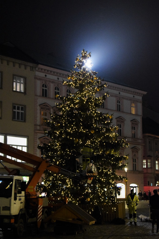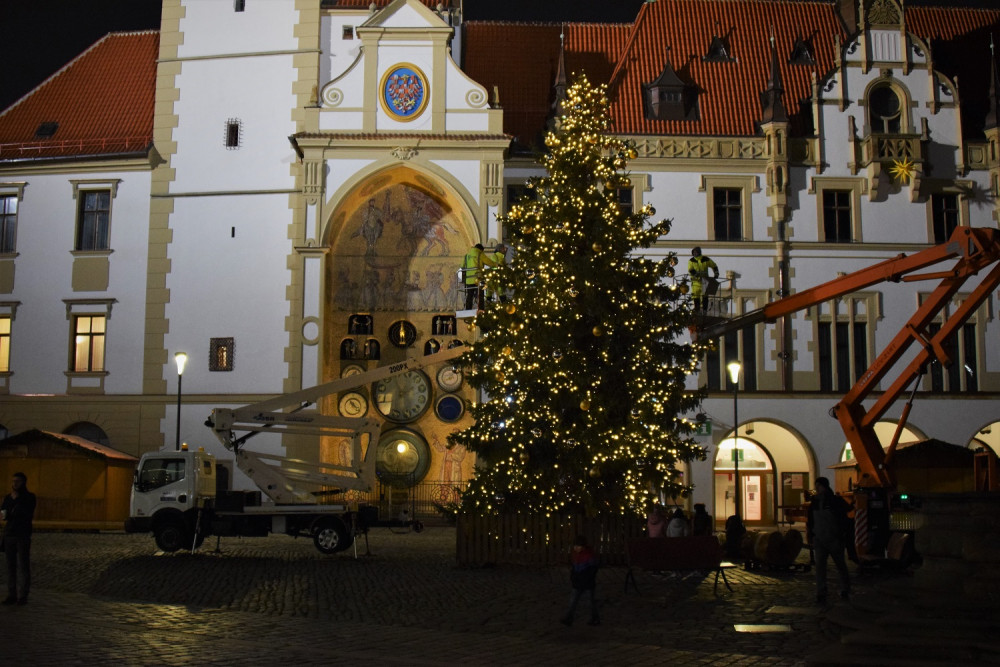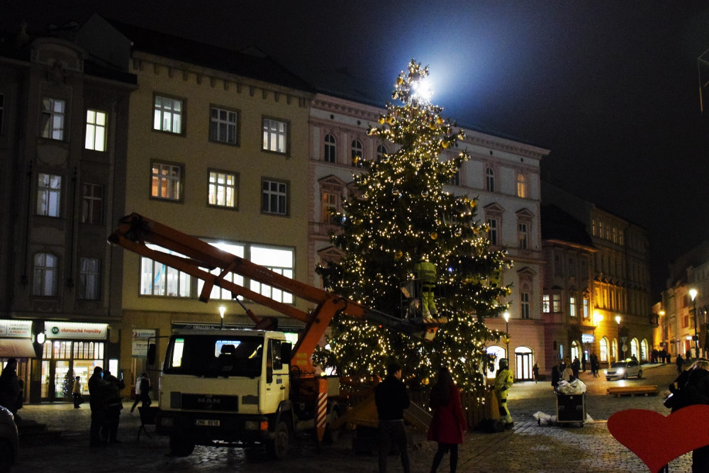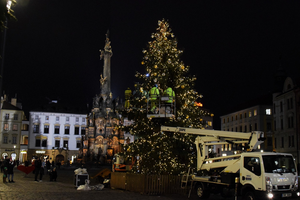 Ačkoliv je rozsvícení vánočního stromečku na olomouckém Horním náměstí avizováno až na první adventní neděli, už ve středu 25. listopadu se kolemjdoucím občanům naskytla příležitost vidět jej v plném nasvícení. Právě ve středu odpoledne totiž pracovníci na dvou vysokozdvižných plošinách stromeček zdobili.