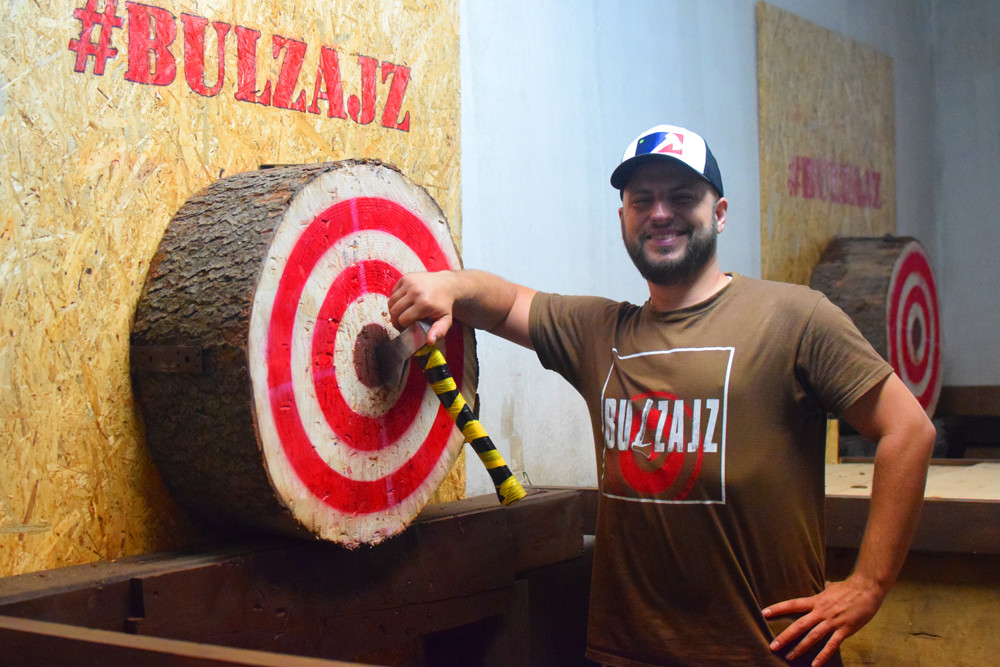 Název Bulzajz vychází z angličtiny, jako Bull’s-eye se totiž označuje střed terče. Právě střed terče by měl být místem, do kterého by se při soutěžení ideálně měla zaseknout sekera. Ještě než se k mohutnému smrkovému terči dostaneme, musíme si zvolit zbraň, které budeme věřit. „Když přijdou hodně malé děti, tak jim většinou dám tomahawk, ale pro starší jsou tady kromě seker k mání i sekáčky na maso nebo mačety,“ říká Efraim, ale já se radši rozhodnu pro starou dobrou sekeru, která není nijak speciální, kterou znám, a která na mě tedy z nabízených nástrojů působí nejdůvěrněji.