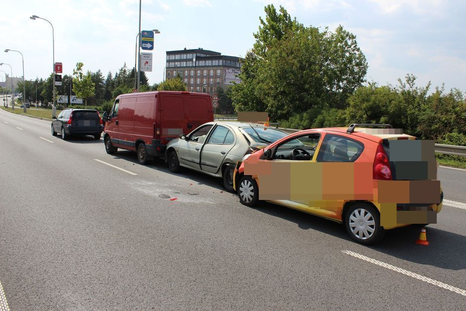 Na Velkomoravské se stala řetězová nehoda, srazila se tam celkem čtyři auta. Jedna žena se zranila