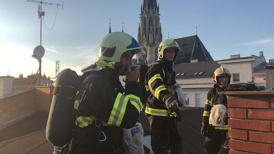 Hasiči v úterý odpoledne likvidovali hasičskými přístroji požár klimatizační jednotky na střeše třípatrového domu nedaleko Olomouce.