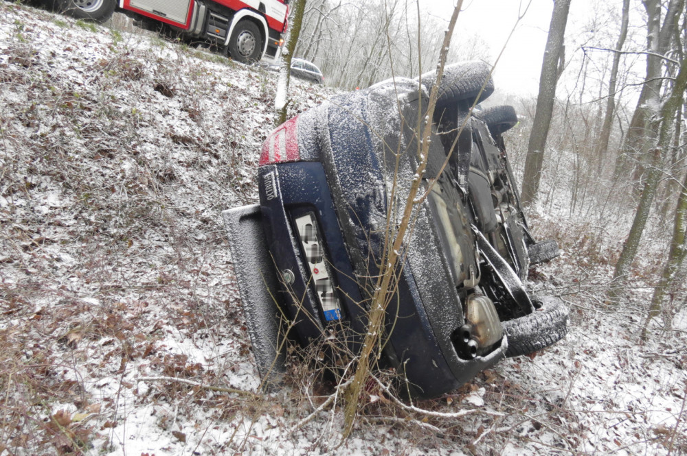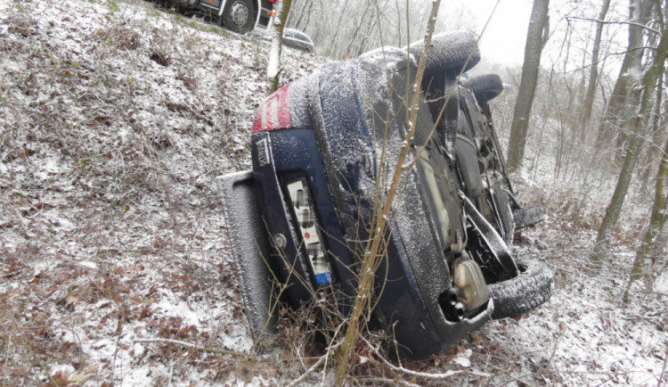 Žena podcenila jízdu po ujetém sněhu a dostala smyk. Škodovka skončila na střeše v blízkém lese