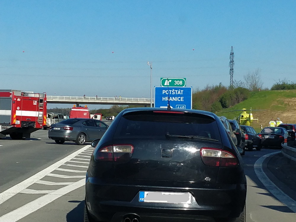 Vozidla sjíždí mimo dálnici u sjezdu na 308. kilometru. Na místě zasahují policisté, hasiči i záchranářský vrtulník. Jedno z vozidel je na boku. „Podle prvotních informací došlo při nehodě ke zranění dvou osob. Přesné příčiny nehody, její okolnosti a souvislosti jsou v šetření," dodala policejní mluvčí Irena Urbánková.