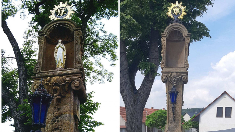 Boží muka u jednoho z rodinných domů v Teplicích nad Bečvou přišla na začátku týdne o svou chloubu. Neznámý pachatel zde odcizil mramorovou sochu Panny Marie.