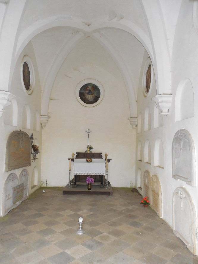 V interiéru hrobky je pět kruhových olejomaleb v rámech z omítky. „V podélných stěnách ve třech řadách nad sebou je zasazeno do zdi 19 náhrobníků z různých druhů mramoru a jeden ze dřeva, kryjících hrobové komory,“ doplnil mluvčí památkářů.