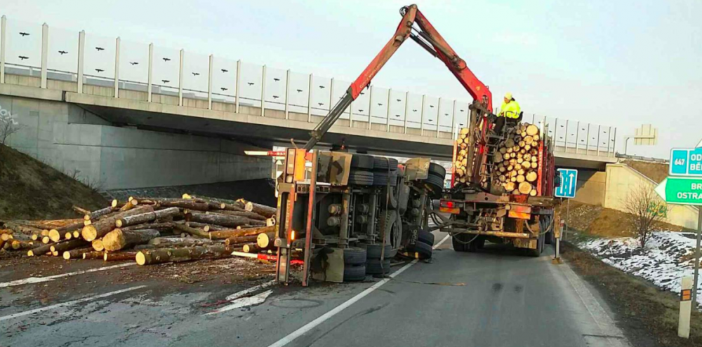 Dnes po čtvrté hodině odpolední došlo k dopravní nehodě na sjezdu z dálnice D48 u Bělotína. Z nákladního vozu se uvolnily klády a kompletně zablokovaly cestu.