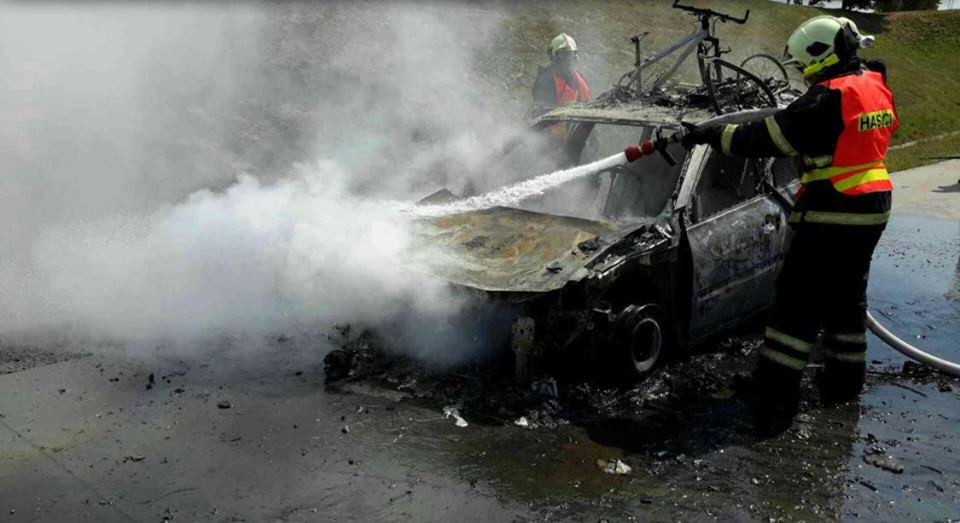 Auto začalo hořet na dálnici u Velkého Újezdu. „Požár osobní auto zcela zničil, a to včetně cyklistických kol, které byly na autě připevněné. Oheň se také rozšířil i na travní porost u dálnice," řekl mluvčí hasičů Zdeněk Hošák.