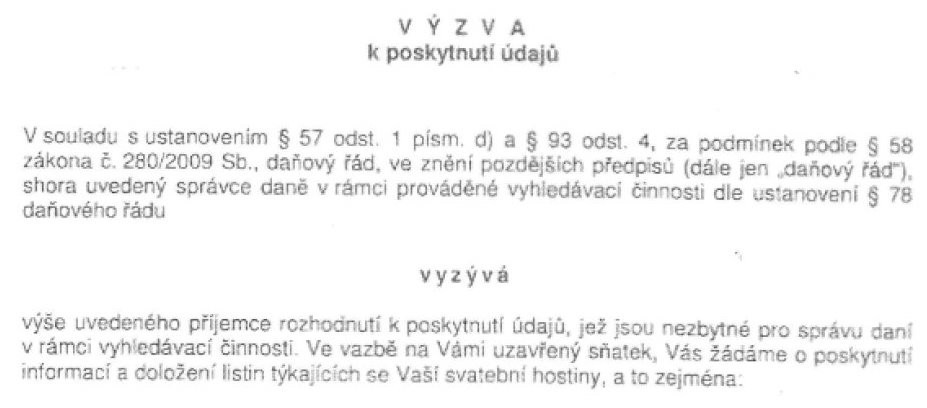 V textu interpelace stojí, že územní pracoviště Finančního úřadu pro Olomoucký kraj v Přerově požádalo s odvoláním na ustanovení daňového řádu novomanželský pár o poskytnutí údajů a listin týkajících se jejích svatební hostiny. Šlo o to, kde se konala hostina, kde se ubytovali svatební hosté a kolik jich bylo na svatební hostině. Úřad chtěl také vědět, jak byla svatba vyúčtovaná, zda byl vystaven účetní doklad a od novomanželů požadoval informaci, kolik zaplatili.