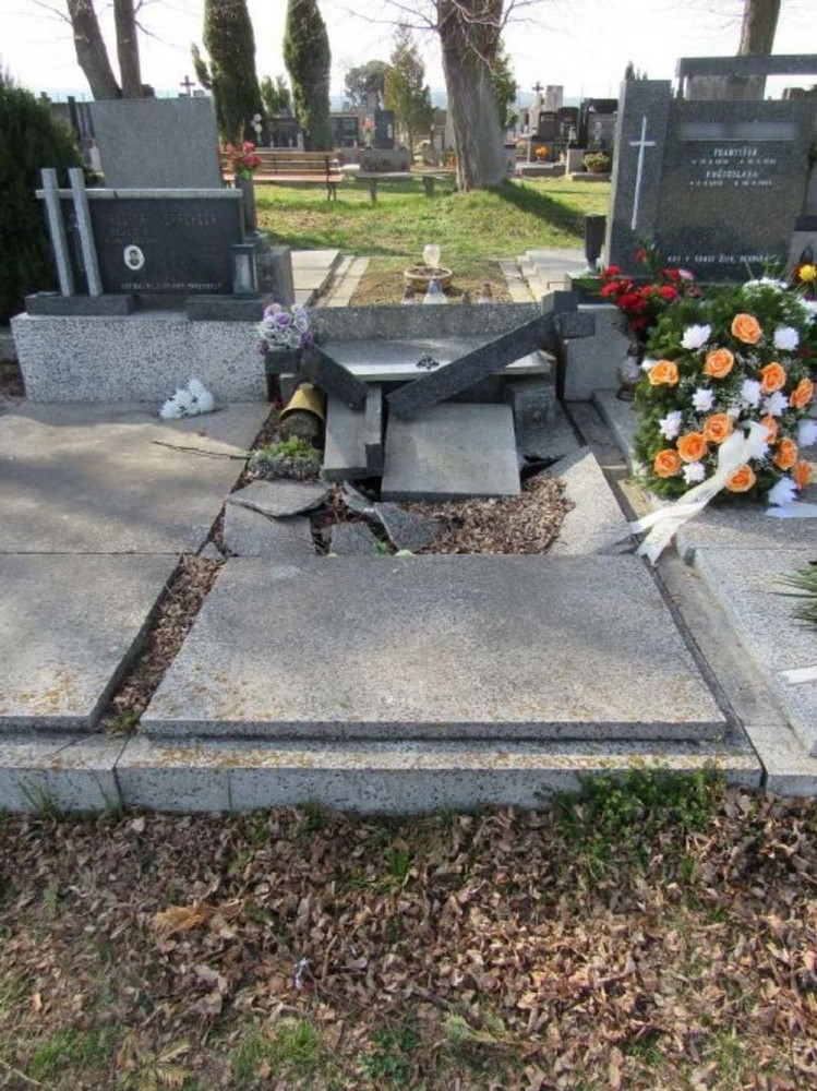 Pachatel shodil ze zděné podesty náhrobní desku jednoho hrobu. Ta při pádu spadla na vedlejší hrob, který se tímto také poškodil. „Majitelka škodu způsobenou na náhrobní desce předběžně vyčíslila na 15 tisíc korun. Škoda na druhém hrobu vyčíslena dosud nebyla. Policisté ve věci zahájili úkony trestního řízení pro podezření z přečinu poškození cizí věci a přečinu výtržnictví. Za ty pachateli v případě dopadení a prokázání viny hrozí trest odnětí svobody až na dvě léta,“ uvedl policejní mluvčí František Kořínek.