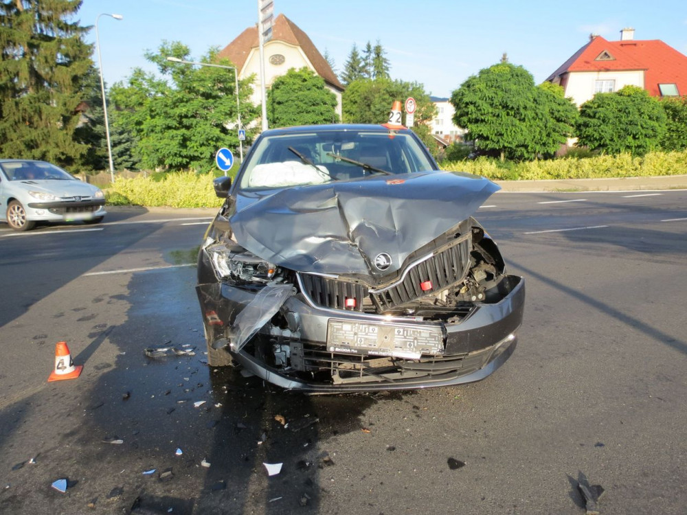 Dvaadvacetiletý řidič nedal při vyjíždění z ulice J. z Poděbrad přednost v jízdě řidičce, která jela po hlavní silnici od Bratrušova. Došlo tak ke střetu předních částí aut. Řidička při nehodě utrpěla lehké zranění.