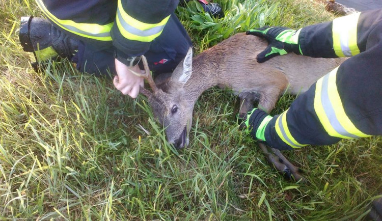 Hasiči zachránili srnce, který plaval v betonovém náhonu a nemohl se dostat ven