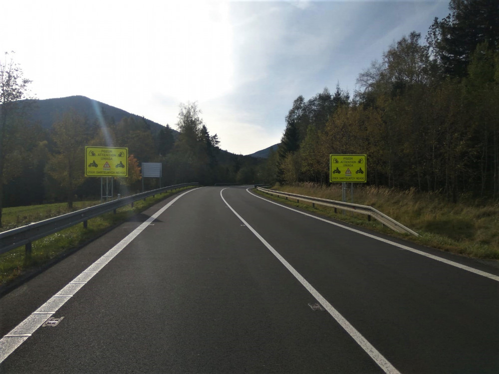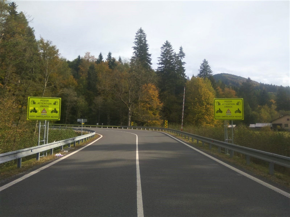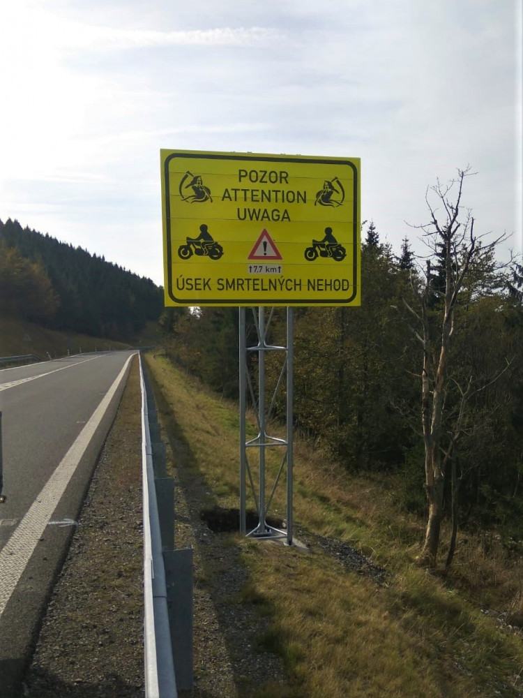 Nové značky na Červenohorské sedlo nainstalovalo Ředitelství silnic a dálnic (ŘSD). Nové značení má upozornit řidiče na úsek, kde se často stávají smrtelné nehody. Reflexní tabule a varovné nápisy v několika cizích jazycích doplňují tematické symboly a všeříkající kostlivci s kosou.
