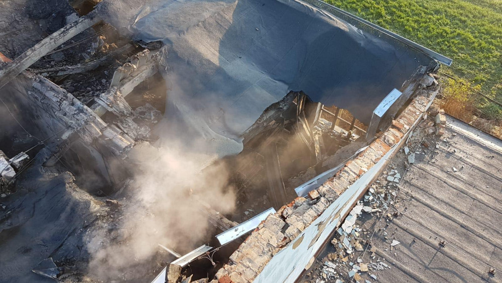 „Ráno na místo dorazil tým vyšetřovatelů hasičského záchranného sboru. Zjistil, že je konstrukce střechy nestabilní a nelze se pod ní bezpečně pohybovat. Jeho členové proto rozhodli, že dojde k odstranění nebezpečných částí střechy těžkou technikou, aby to vyšetřovatele nezasypalo," uvedl Hošák.