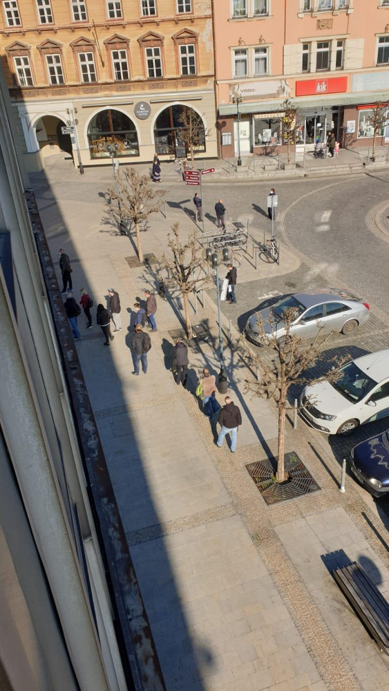 Magistrát, který funguje v omezeném režimu, má v současné době otevřená tři z pěti přepážek, a protože klienti dodržují zodpovědné rozestupy, dlouhá fronta sahá až na část Masarykova náměstí. „Aby nebyly problémy, stojí u vchodu strážník městské policie a pouští klienty do budovy postupně, aby nedocházelo k nežádoucímu shlukování,“ doplnila Jitka Kočicová z přerovského magistrátu.