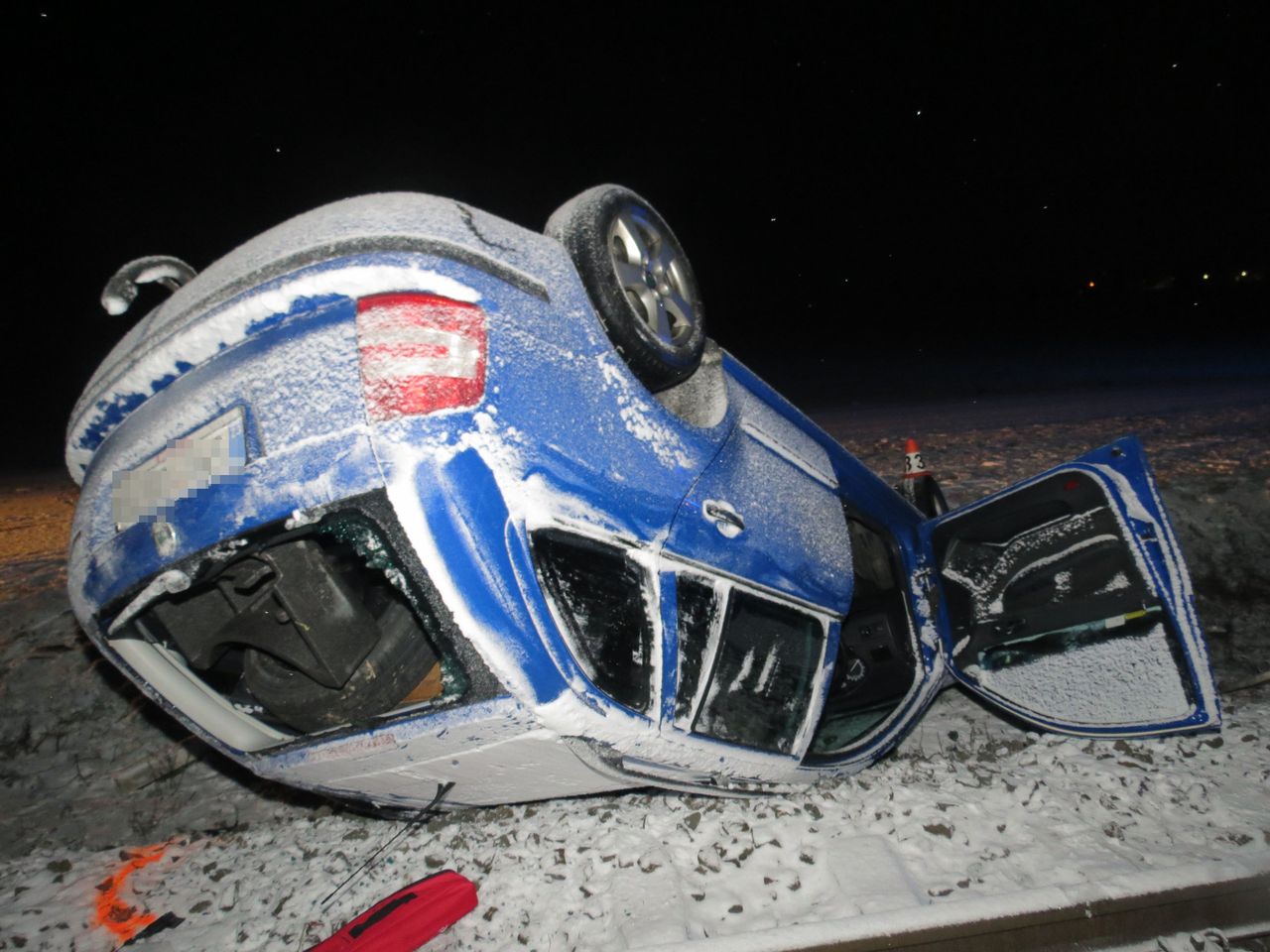 Mladá řidička dostala smyk na zasněžené silnici. Auto se převrátilo na střechu