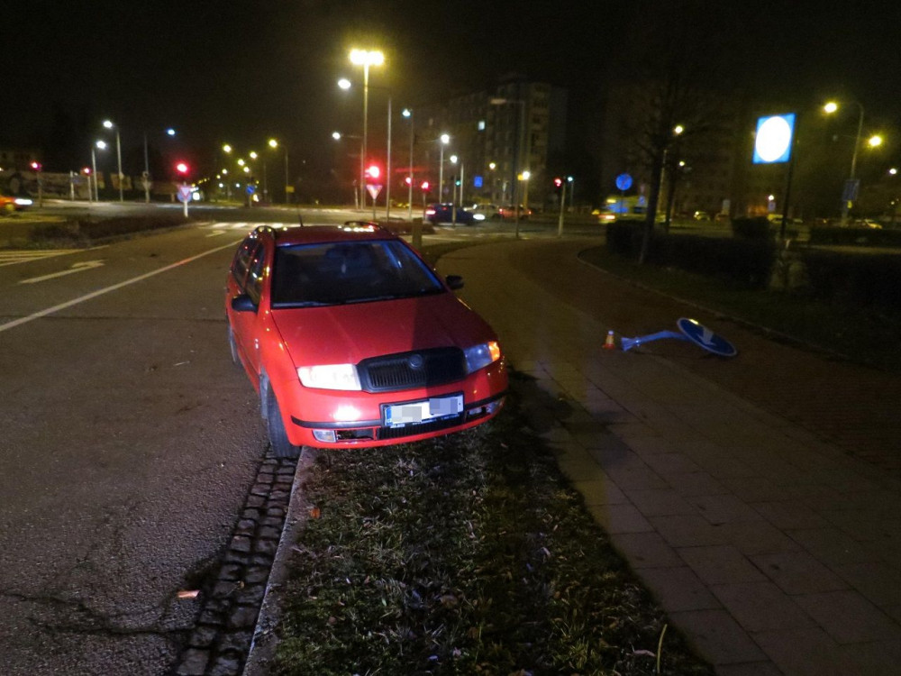Opilý řidič nezvládl na Nový rok odbočit ve Velkomoravské ulici, porazil značku a skončil mimo silnici