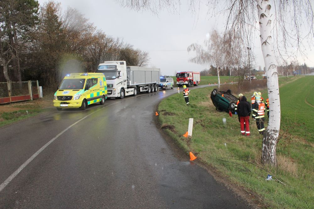 K dopravní nehodě, po které skončilo auto na střeše, vyjížděli policisté, hasiči a záchranáři v pondělí 25. března 2019 před půl jedenáctou dopoledne na silnici mezi Plumlovem a Mostkovicemi.