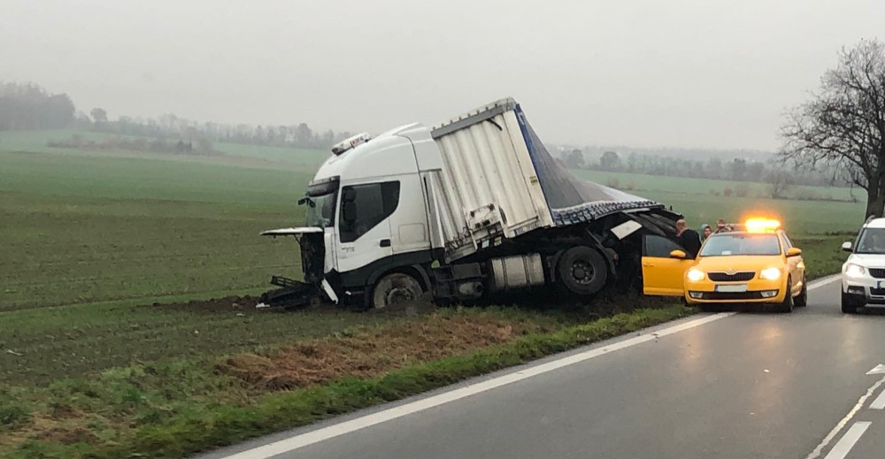 Kamion sjel mimo silnici do příkopu, kde havaroval. Alkohol byl u řidiče vyloučen orientační dechovou zkouškou, ke zranění osob nedošlo.