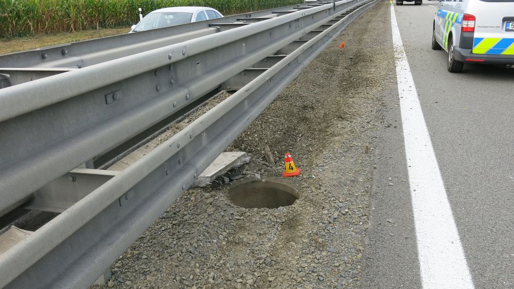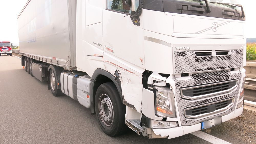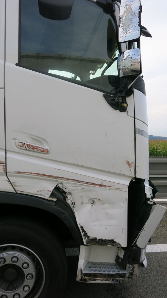 Ve vedlejším levém pruhu se však kamion levou zadní částí návěsu střetl s pravou přední částí nákladního automobilu Volvo. Kamion jedoucí v levém pruhu byl druhým vozidlem vytlačen vlevo mimo komunikaci, kde se střetl se svodidly a poškodil betonový kryt kanalizační vpusti.