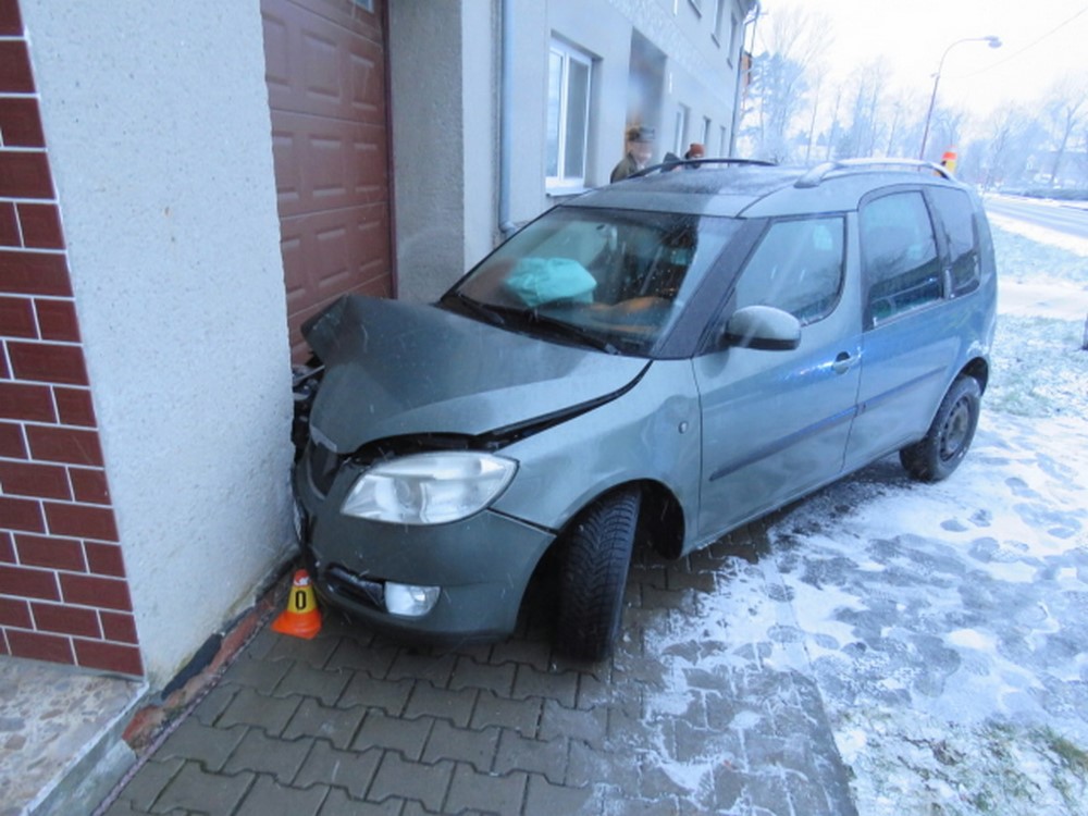 V neděli ráno jel šestapadesátiletý řidič po zasněžené silnici. Při průjezdu pravotočivou zatáčkou řidič dostatečně nezpomalil jízdu, dostal smyk, přejel trávník vedle silnice a jeho auto zastavila až fasáda rodinného domu.