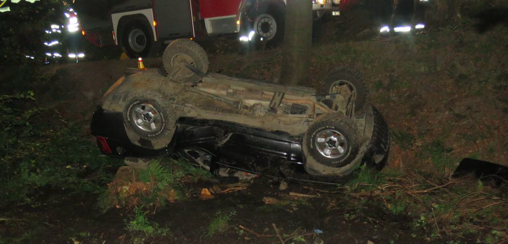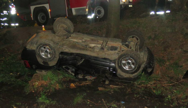 Opilý řidič havaroval se svým Jeepem, vozidlo skončilo na střeše. Hasiči museli zraněného spolujezdce vyprostit