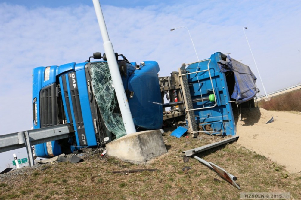 U poslední, třetí dopravní nehody aktuálně stále zasahuje opět jednotka hasičů stanice Olomouc a to zhruba od třinácté hodiny. Nákladní vozidla se při sjezdu z rychlostní komunikace u sjezdu na Olomouc, místní části Slavonín, převrátilo na bok a zůstalo zaklíněné ve svodidlech. Situace dle popisu oznamovatele vyžadovala vyproštění dvou pasažéru se zdemolované kabiny vozidla. V době dojezdu jednotky k události byly obě osoby mimo havarované vozidlo, došlo ke zranění jedné osob, té byla poskytnuta jednotkou hasičů předlékařská pomoc. Na místě pokračujeme v likvidaci úniku velkého množství provozních kapalin a pokračují další nutná bezpečností opatření před příjezdem vyprošťovacího speciálů soukromé společnosti.