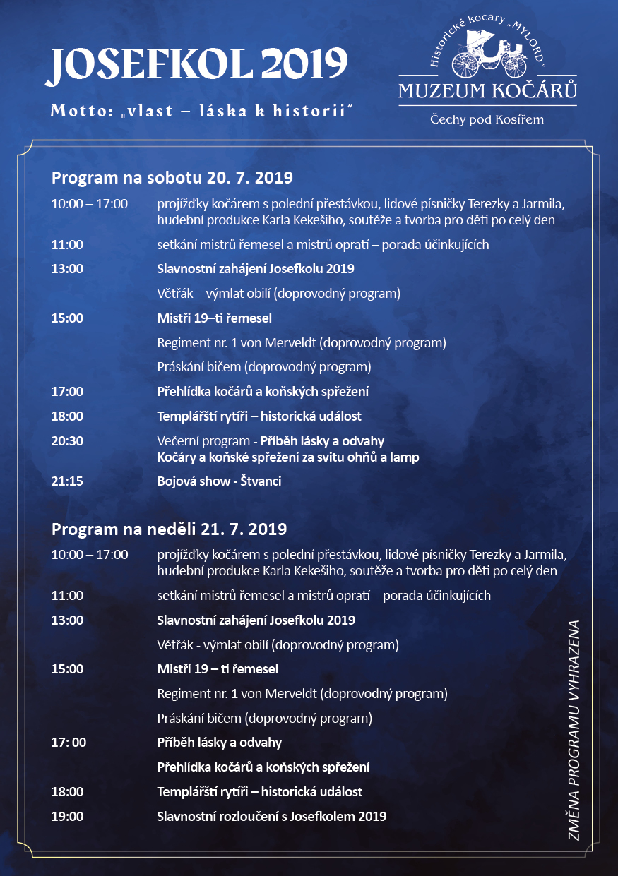Letošní ročník akce nese motto "Vlast - láska k historii", a v jeho duchu se bude i celý doprovodný program odehrávat. K vidění budou historické kočáry, návštěvníci si mohou prohlédnout historické stroje a stavbu kočárů, svoje představení zde budou mít i kaskadérská společnost Štvanci. Jedním z hlavních bodů programu bude příjezd Templářských rytířů.