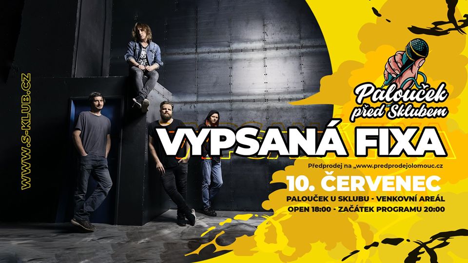 Pardubická skupina Vypsaná Fixa zahraje na paloučku před Sklubem, a to od osmi hodin večer. Písničky jako Antidepresivní rybička, 1982, Detaily nebo Čtyři slunce můžete slyšet i vy, protože vstupenky jsou stále k dispozici a jedna stojí 380 korun.