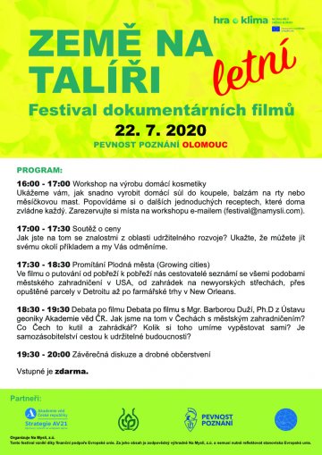 V Olomouci se ve středu 22. července od 16:00 uskuteční 5. ročník festivalu dokumentárních filmů o jídle, Země na talíři. Letošním tématem bude městské zahradničení. Návštěvníci se v Pevnosti poznání mohou těšit na filmovou projekci, diskuzi, soutěž i workshop. Vstup je na celou akci zdarma.