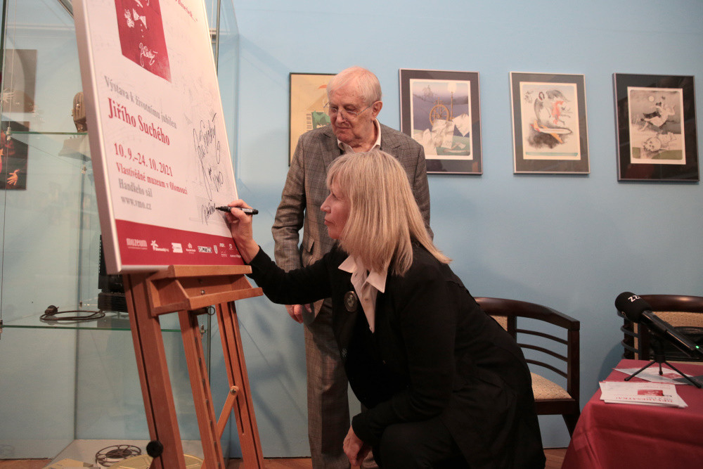 Výstava Jiřího Suchého v Olomouci k 90. narozeninám. Na snímku podepisuje plakát Jitka Molavcová
