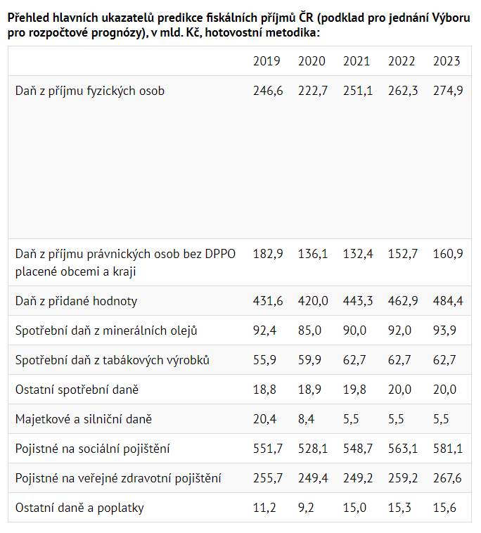 V letech 2022 a 2023 by příjmy měly růst ze všech daní i pojistného. Pouze u spotřebních daní z tabákových výrobků MF uvádí pro roky 2021 až 2023 stejný výnos 62,7 miliardy korun ročně a u majetkových a silničních daní 5,5 miliardy korun.