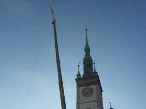 Dva mobilní jeřáby s výložníky o délce asi 85 metrů na Horním náměstí v Olomouci demontují nejvyšší část radniční věže, která je vysoká 75 metrů. Jedná se o demontáž asi dvanáctimetrové špice věže. Tato akce je technickou přípravou na chystanou rekonstrukci radniční věže, uvedl mluvčí města Michal Folta.