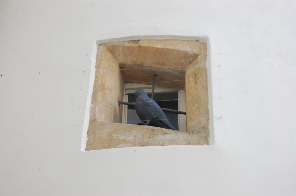 Makety havranů, kteří jsou v přírodě přirozenými nepříteli holubů, vykukují z oken radniční věže a jsou zajištěny proti vypadnutí drátky. Atrapy zmenšily volný prostor na římse pro případné přistání holubů.