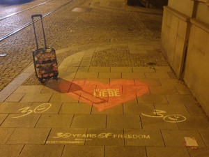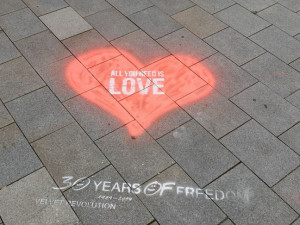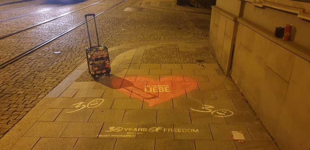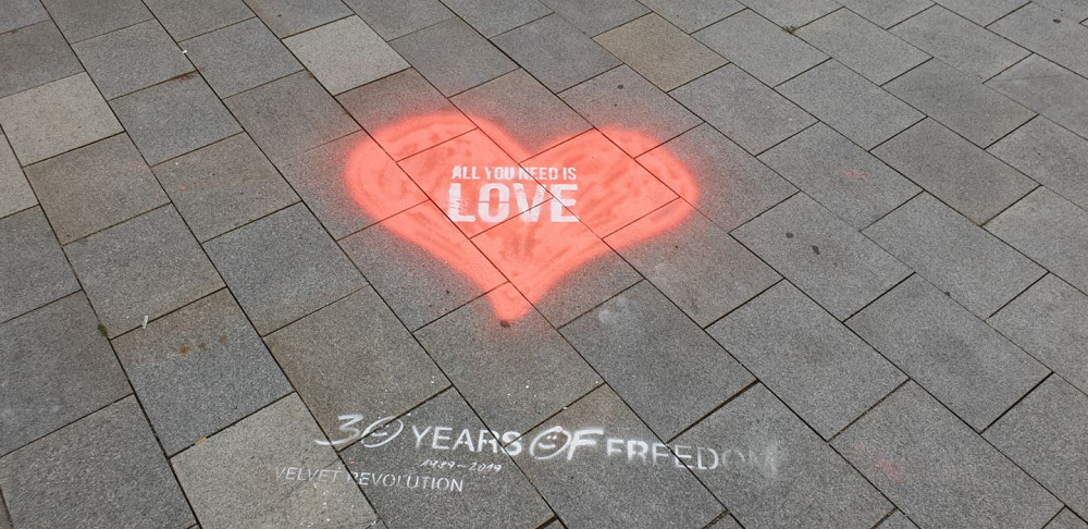 Proč se vlastně srdce v centru našeho města objevila? „Již 30 let žijeme ve svobodné zemi, kde pravda a láska může vzkvétat. Všichni a všechno potřebujeme svobodu pro svou tvořivost. Pocit lásky a štěstí tvoří umění, které nám nabízí svobodné myšlení a cítění. Vážíme si toho a proto bereme do svých rukou křídy a malujeme v barvách lásky po městě, které nám tak přirostlo k srdci," stojí na letáku, který nechávají lidé na místě u srdce.