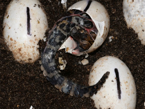 „Ve volné přírodě matka vzorně hlídá hnízdo, které si staví ze zetlelého materiálu. Jakmile uslyší zvuky podobné žabímu kvákání, začne pomáhat mláďatům při líhnutí. U nás tuto péči zastává ošetřovatel a líheň," uvedl Javůrek.