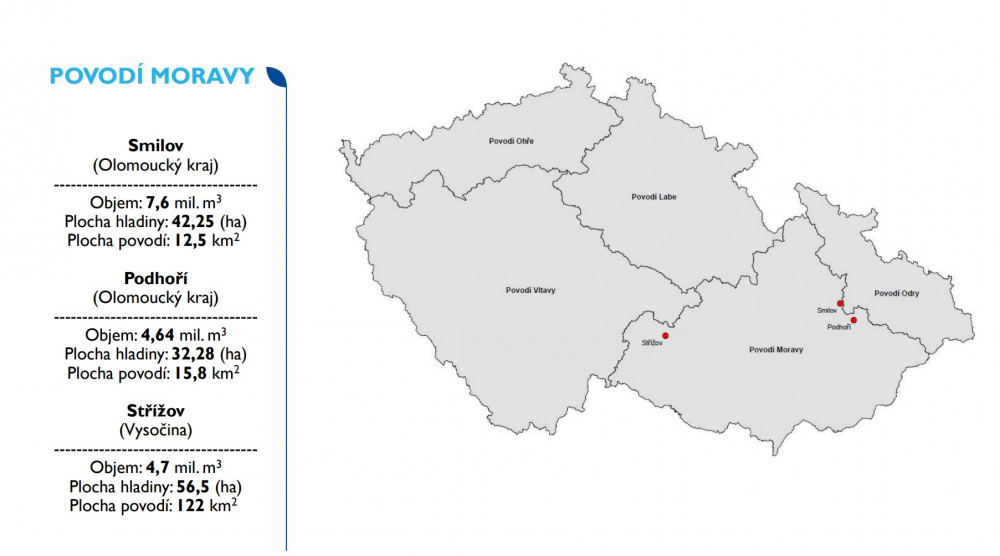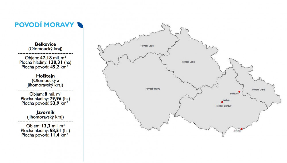 Podle informací zveřejněných na webových stánkách Ministerstva zemědělství, bude mít bělkovická přehrada při rozloze 130 hektarů objem více než 47 milionů kubíků vody. Další nádrže by měly v Olomouckém kraji vzniknout v obcích Holštejn, Smilov a Podhoří. V územně plánovací dokumentaci jsou tyto oblasti označeny jako „územní rezerva“. Tato rezerva neomezuje stávající činnosti, např. umožňuje dočasné stavby s horizontem jejich životnosti zhruba 50 let nebo stavby, jejichž případné vykoupení a odstranění nebude extrémně finančně a technicky náročné.