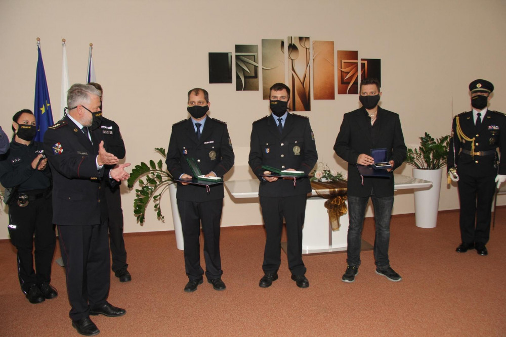 Plaketu a služební medaile „Za statečnost“ udělil policejní prezident Jan Švejdar třem policistům a jednomu civilistovi, kteří svou odvahou přispěli k záchraně životů dvou žen. Tato ocenění jim v úterý dopoledne předal ředitel Krajského ředitelství policie Olomouckého kraje Tomáš Landsfeld na radnici v Javorníku.