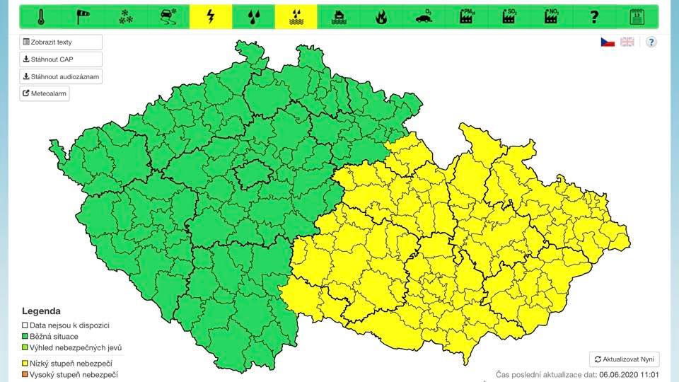 Dnes platí výstraha od 14:00 pro Vysočinu, Pardubický kraj a části krajů Královéhradeckého, Olomouckého, Jihomoravského a Jihočeského. Déšť může lokálně rozvodnit malé toky a zatopit podchody, podjezdy nebo sklepy. „Nebezpečí mohou představovat i blesky a zesílení větru,“ uvedli meteorologové.