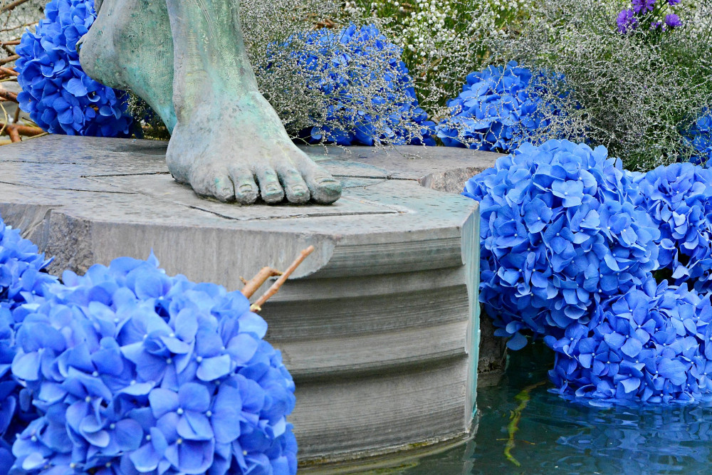 Hortenzie, různé druhy aster, nevěstin závoj, mečíky a další rostliny vytváří půvabnou květinovou sestavu, jejíž převládající modrá a bílá barva koresponduje se samotnou Arionovou kašnou. „Květinová výzdoba umělecky ztvárněnou kašnu krásně doplňuje a rozkvetlá kašna sklízela úspěch už v loňském roce. Letos je koncepce trochu jiná, ovšem neméně atraktivní, navíc se ještě bude měnit,“ vysvětluje náměstkyně primátora Markéta Záleská. Dodala, že květiny jsou nejen prvoplánovou výzdobou města, ale současně i pozvánkou na letní etapu výstavy Flora Olomouc. „Obecně ale mají hlavně přinést lidem radost a přispět k pověsti Olomouce jako města květin,“ říká náměstkyně Záleská.