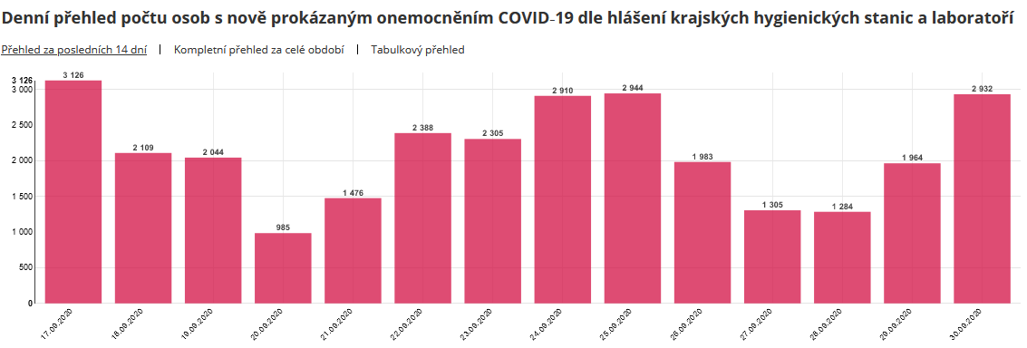 Nejvyšší denní přírůstek v Česku je ze 17. září, kdy hygienici potvrdili 3126 případů koronaviru. Minulý týden ve čtvrtek a v pátek se počty dostaly na 2910 s 2944 odhalených nakažených. Denní přírůstky obvykle rostou zároveň s počty testů, jejich množství za středu ministerstvo zveřejní dnes večer. Podíl nakažených mezi testovanými se poslední zhruba týden drží mezi deseti a 13 procenty.