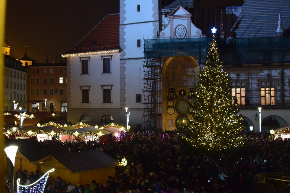 Úderem šesté hodiny večerní se rozsvítil vánoční stromeček na Horním náměstí. Jmenuje se Střelka a osvětluje ji 18 tisíc LED světel, které jsou laděné do zlato-stříbrné. Zdobí ji 120 zlatých a 120 stříbrných koulí.