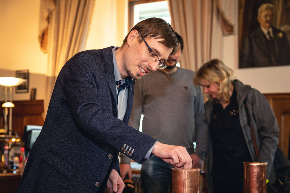 Zaprášený tubus nalezli stavbaři loni v září při rekonstrukci 13 věžiček a ozdobných vikýřů na severní straně střechy radnice, která navazuje na celkovou opravu střechy a krovů. Obsahoval vzácné archiválie, z nichž nejstarší se datují rokem 1704 a nejmladší pocházejí z 60. let minulého století. „Část těchto dokumentů si ponechal památkový ústav s tím, že budou konzervovány a uloženy. Místo nich se do tubusu vrátily téměř nerozpoznatelné faksimile," řekl primátor.